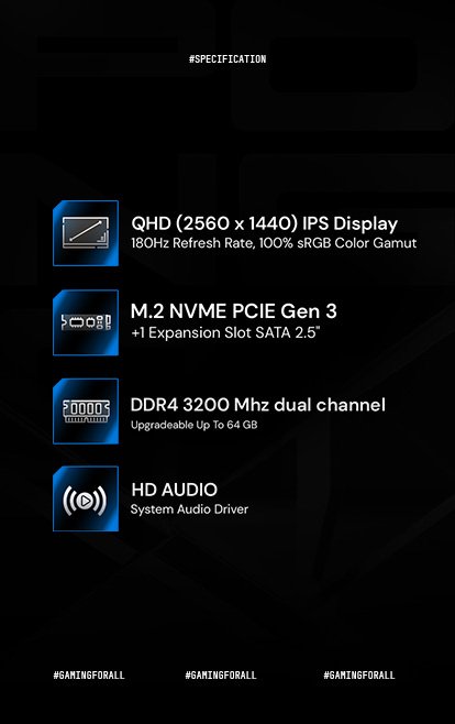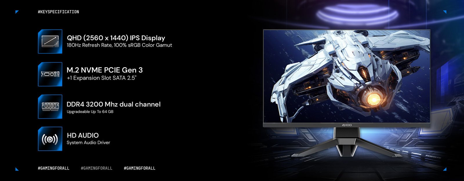 Desktop all-in-one yang menggabungkan spesifikasi tinggi dengan desain elegan yang cocok untuk menghemat ruang di meja kerja. Didukung layar besar 27 inch 2K IPS dengan refresh rate tinggi (180Hz), sRGB 100%, dan dual speaker HD audio sound system.